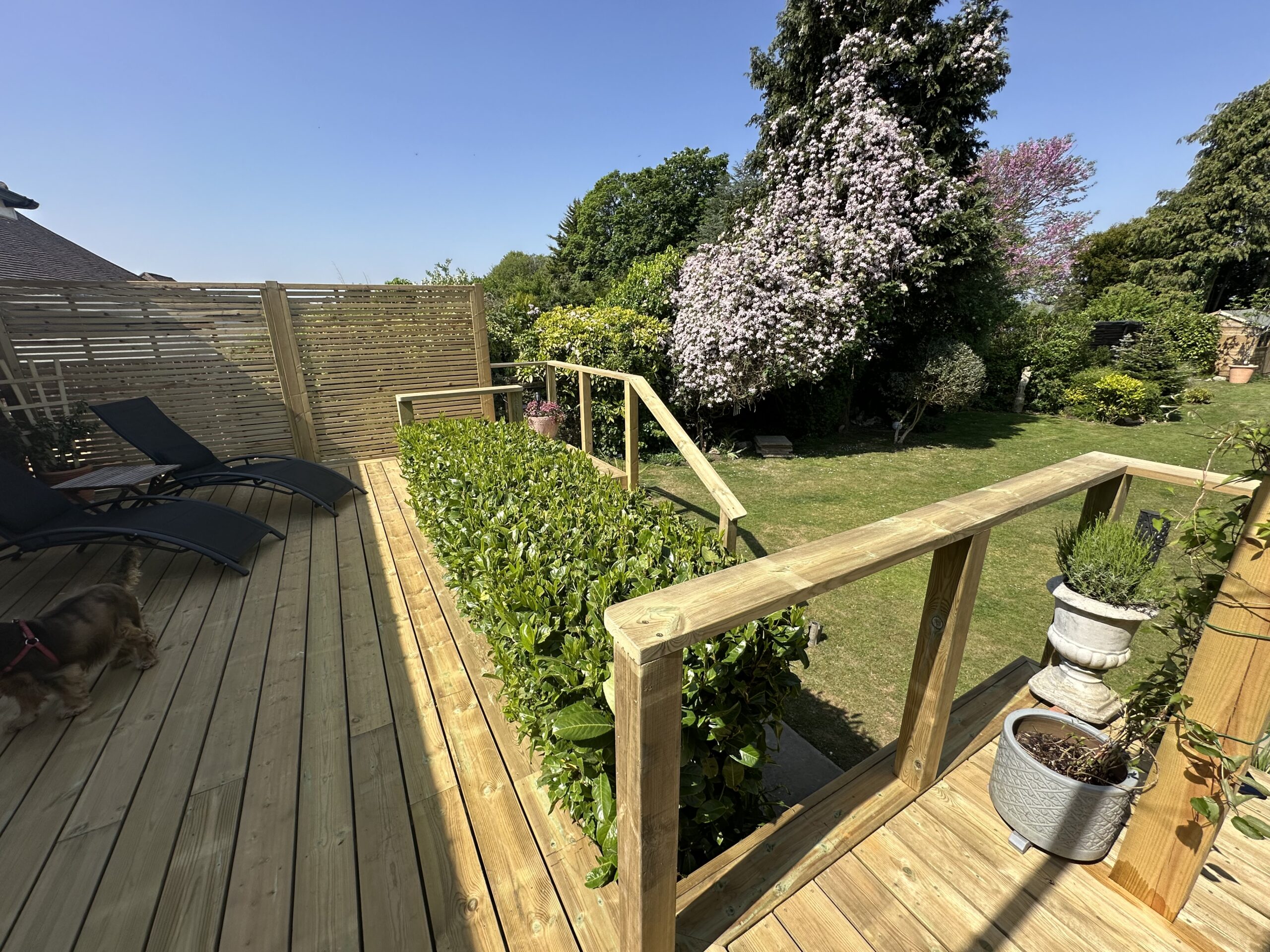 This garden project in Surrey involved the construction of a raised timber decking area with integrated steps, privacy screening, and simple handrail detailing. The aim was to create a practical outdoor space for relaxing and entertaining, while connecting smoothly with the rest of the garden.