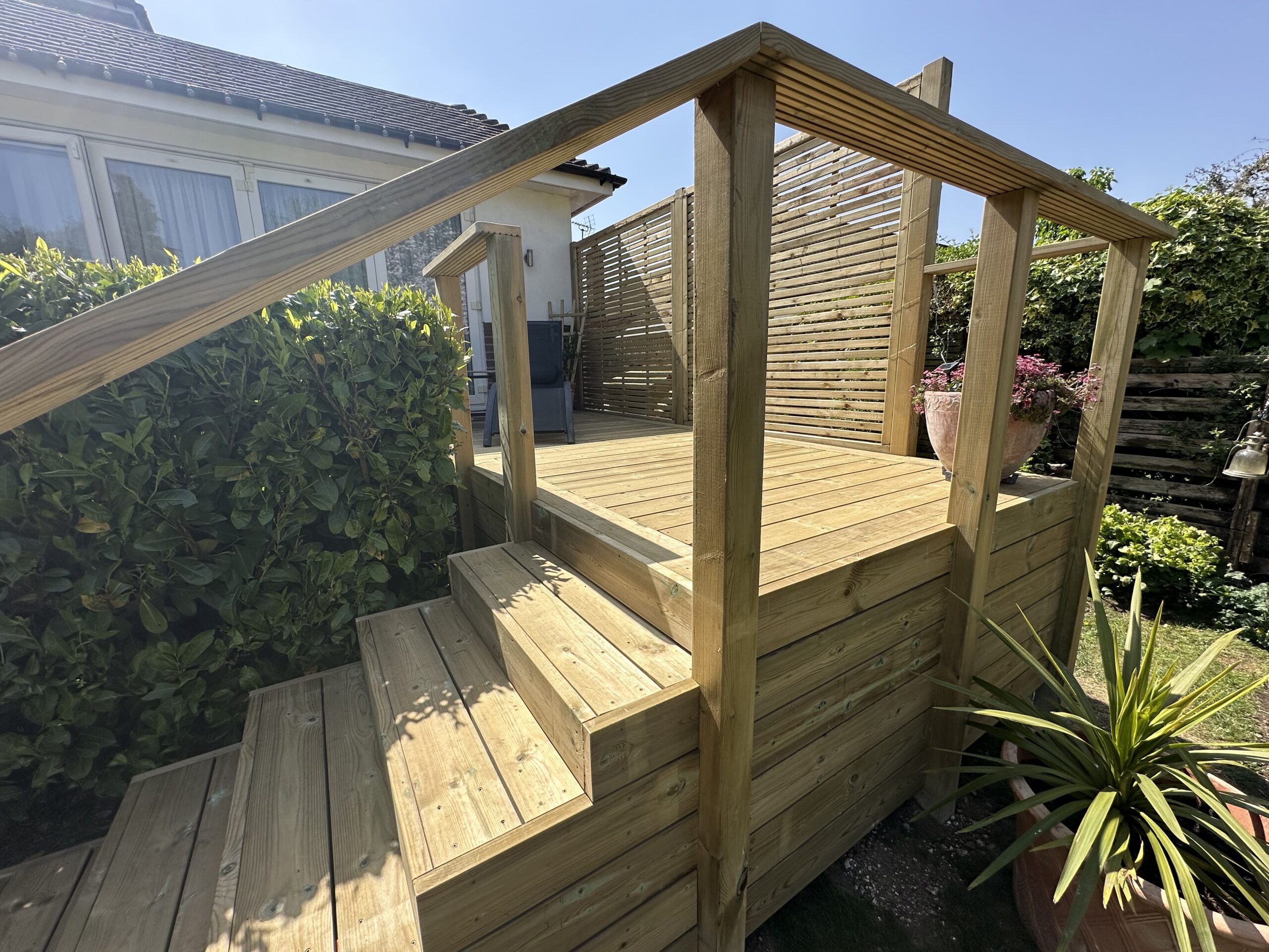 Treated timber decking boards were laid across the frame with precision, keeping the lines clean and consistent throughout. The deck edges were finished with vertical cladding to hide the supporting structure and maintain a tidy look from every angle.