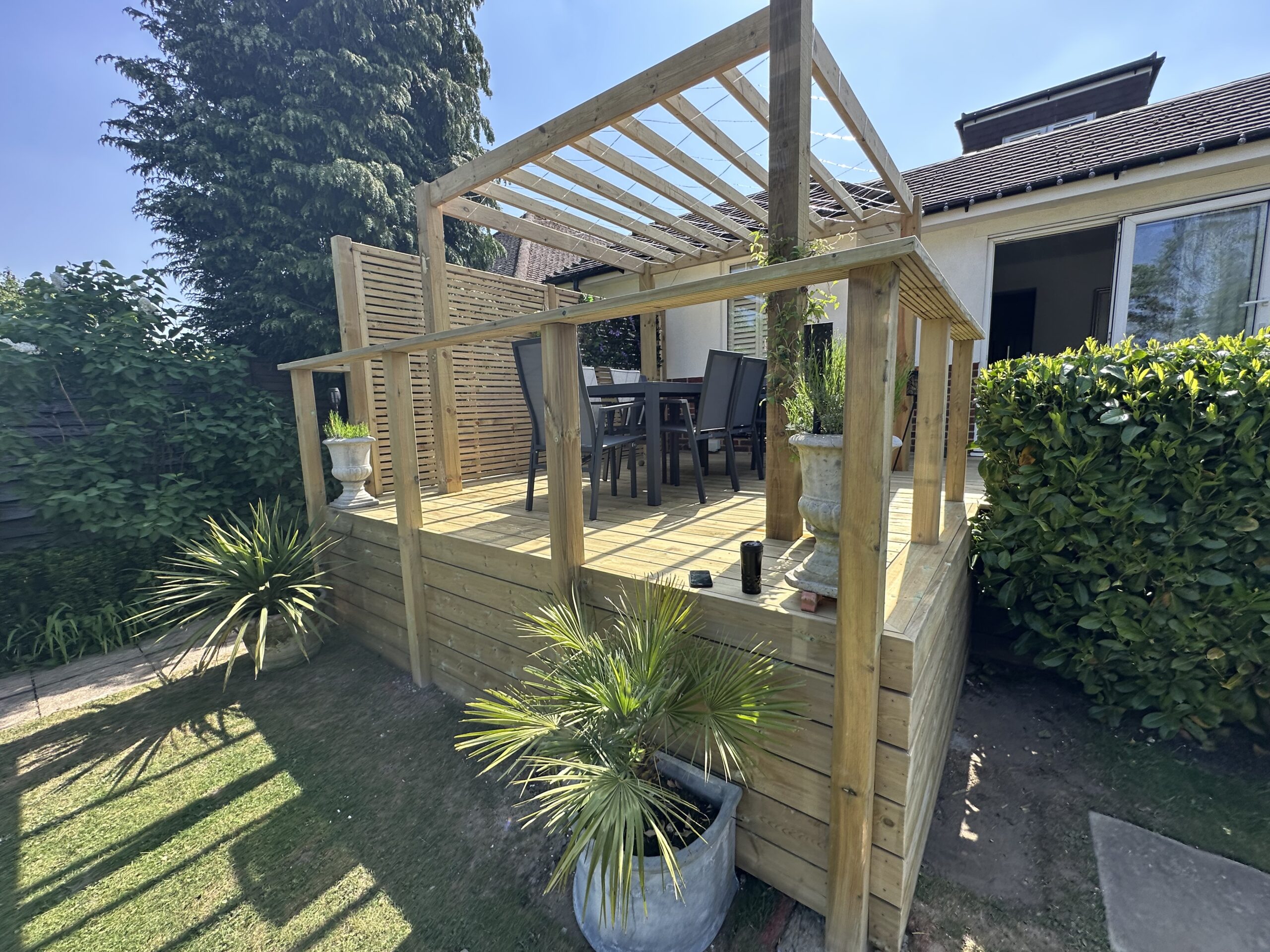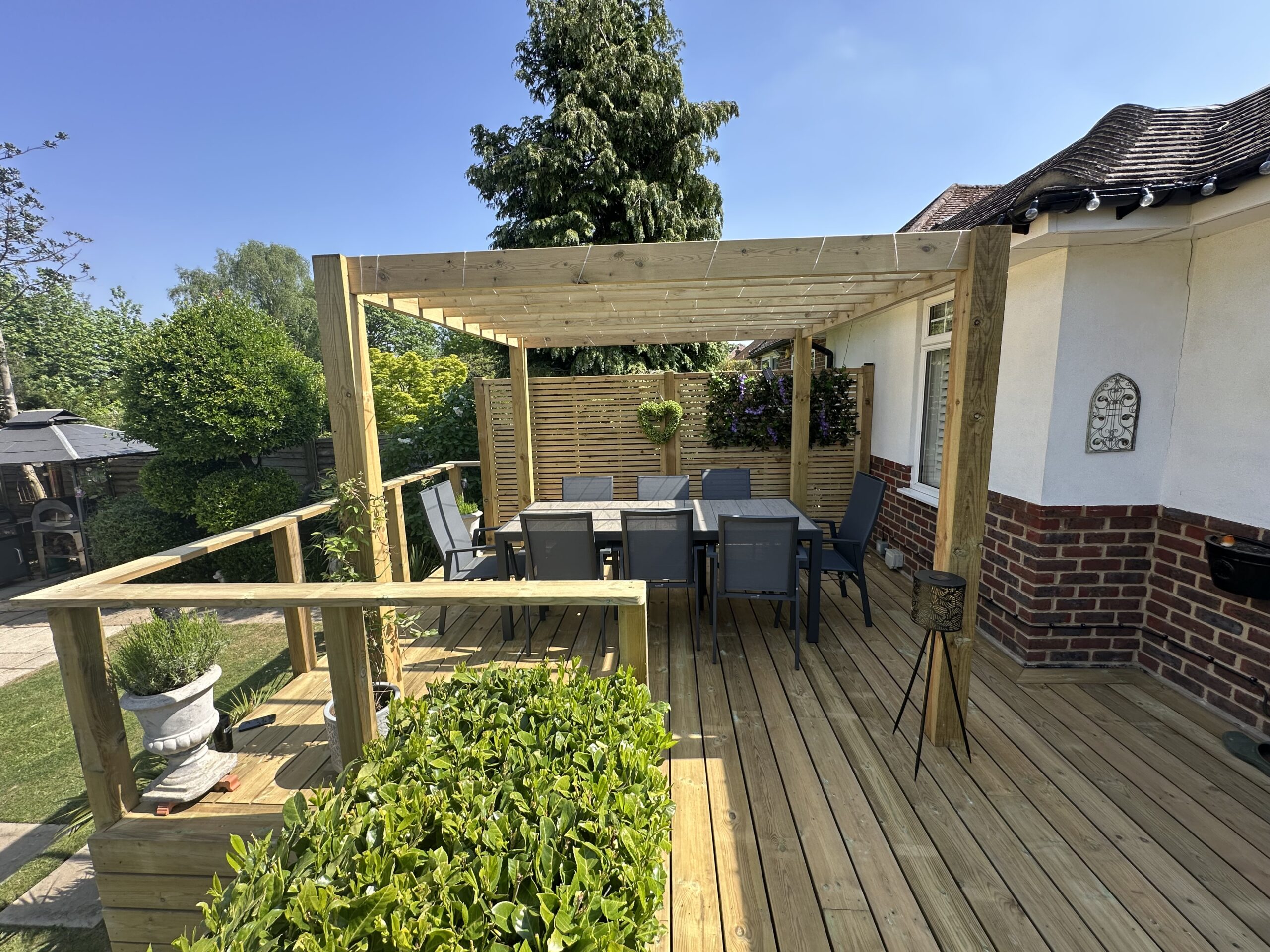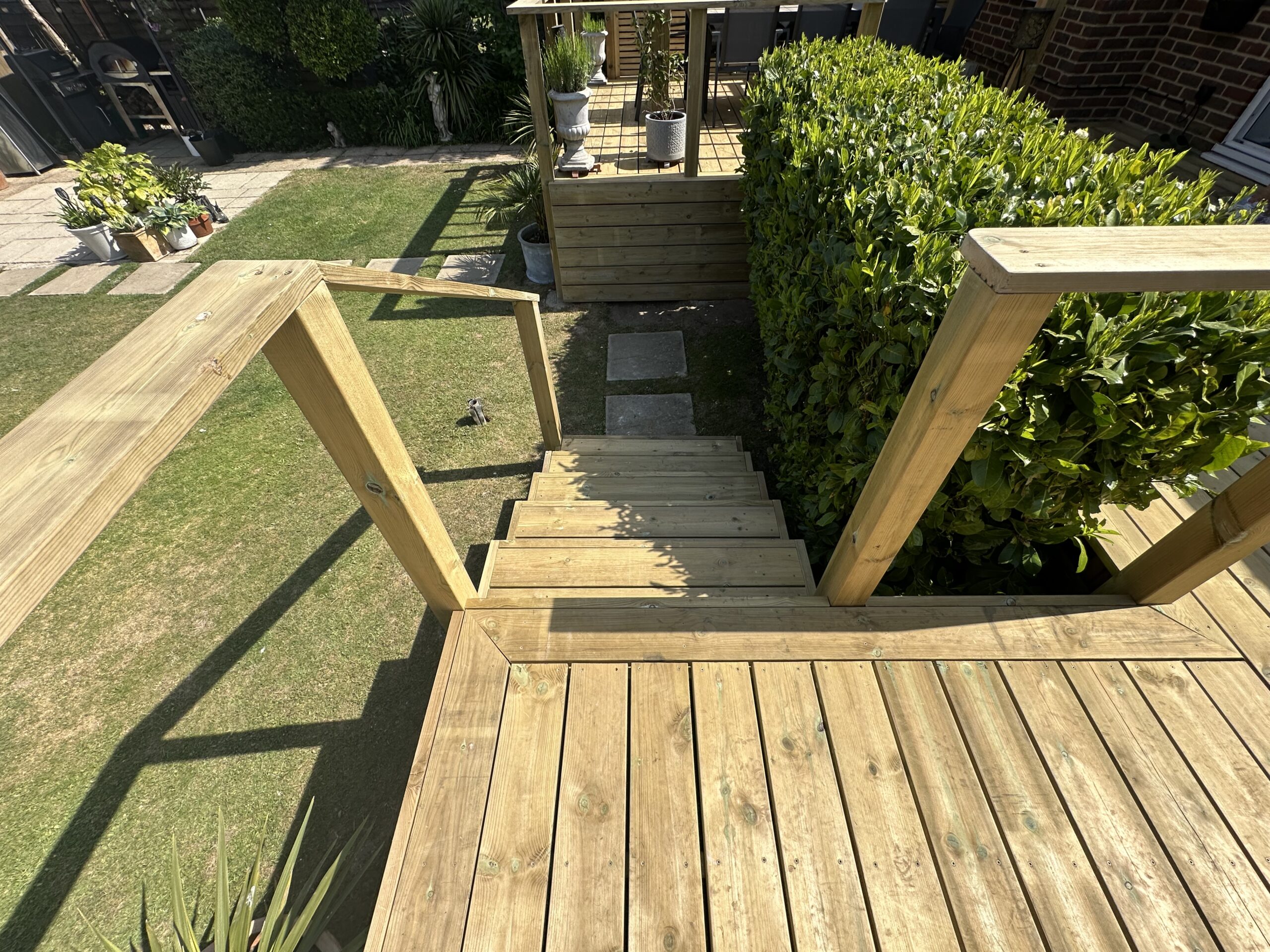 This garden project in Surrey involved the construction of a raised timber decking area with integrated steps, privacy screening, and simple handrail detailing. The aim was to create a practical outdoor space for relaxing and entertaining, while connecting smoothly with the rest of the garden.