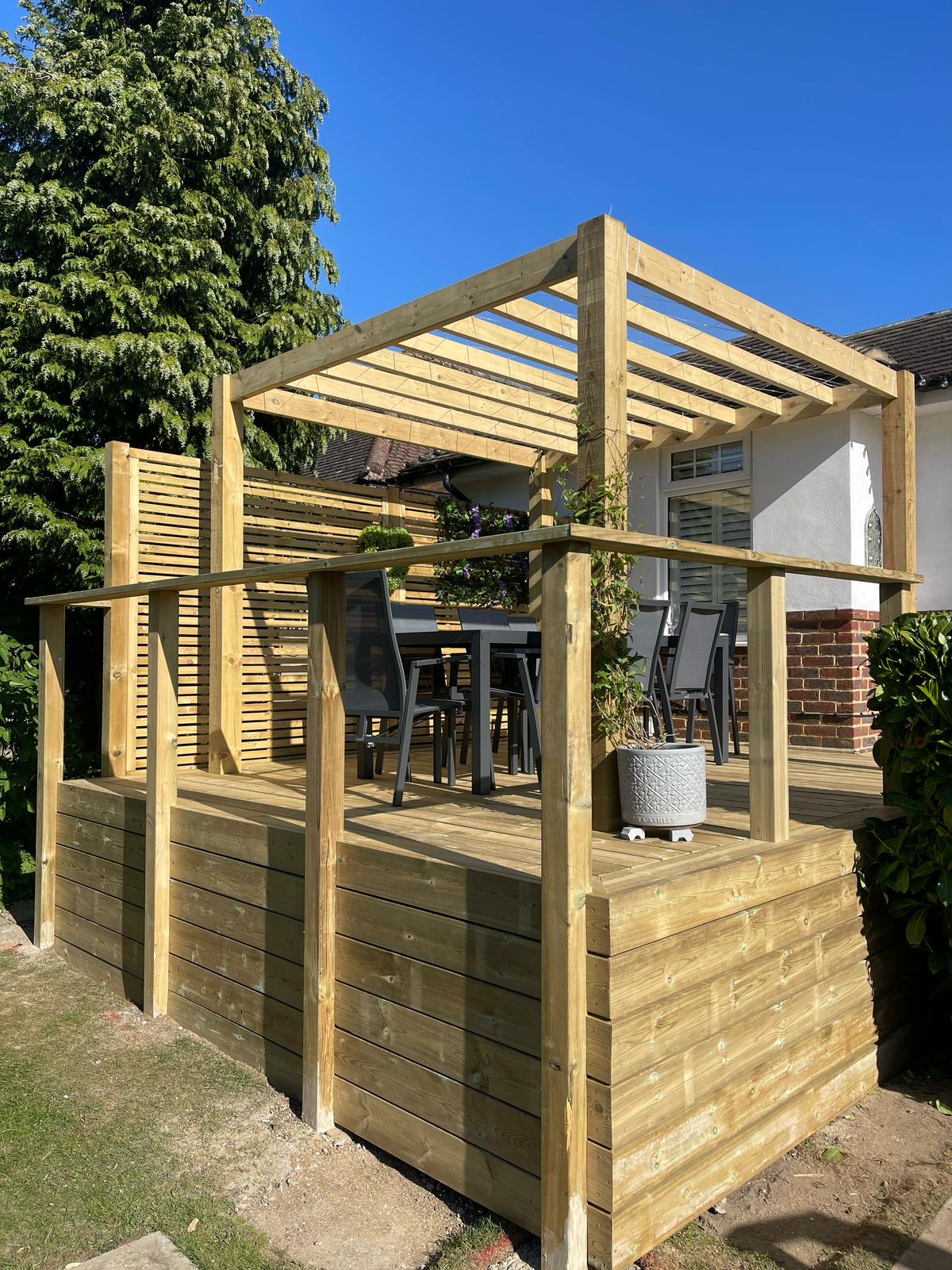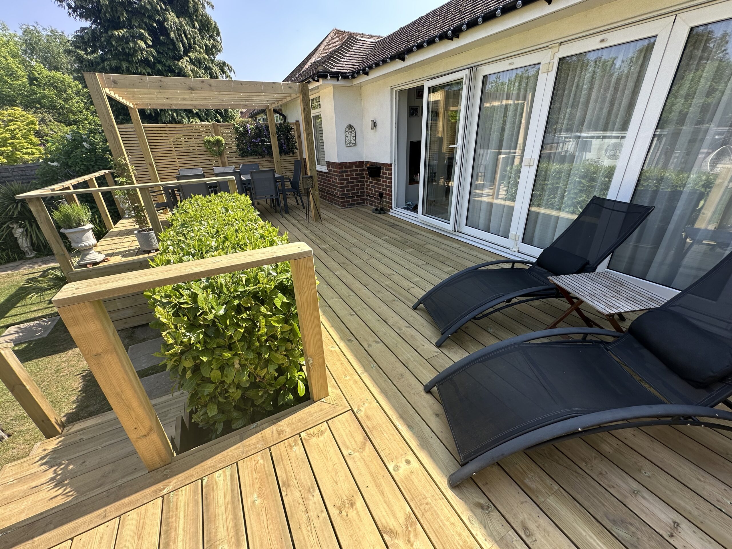Treated timber decking boards were laid across the frame with precision, keeping the lines clean and consistent throughout. The deck edges were finished with vertical cladding to hide the supporting structure and maintain a tidy look from every angle.