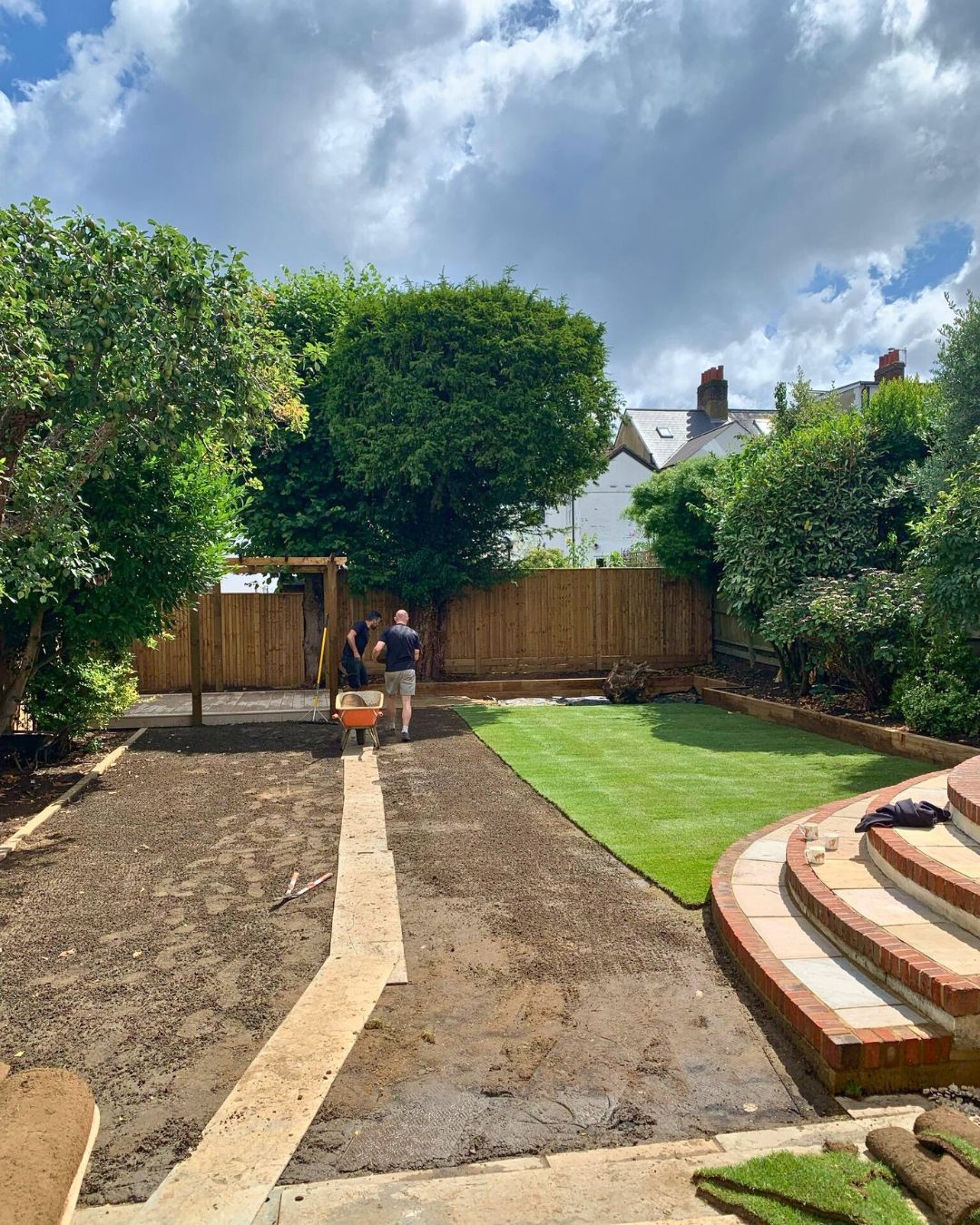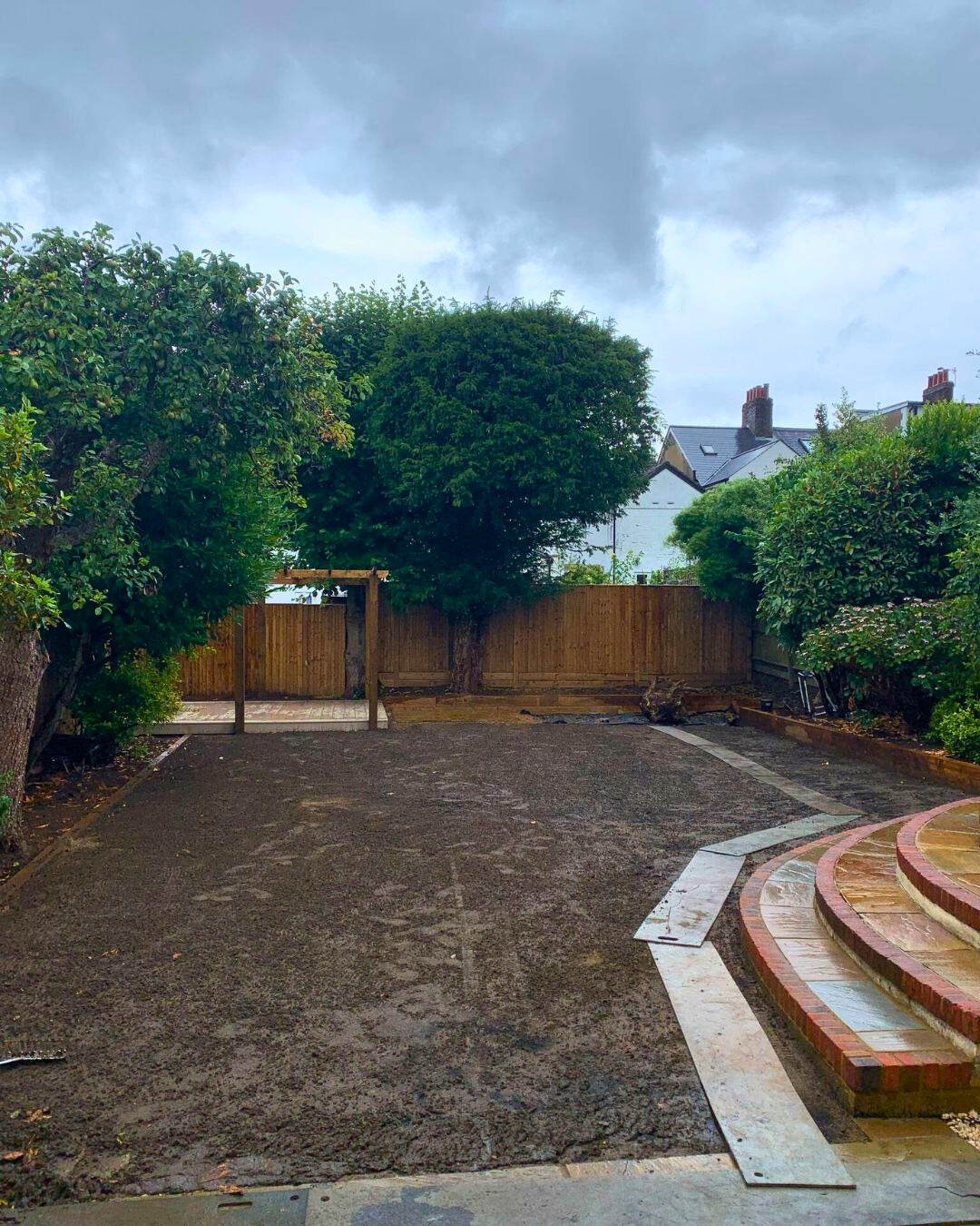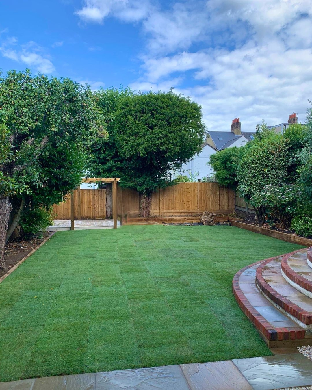 The central garden area was cleared, levelled, and laid with high-quality natural turf. The lawn introduces soft greenery to the space, breaking up the hard landscaping and offering a calm contrast to the pergola and edging. The result is a clean, consistent lawn with neatly trimmed edges.
