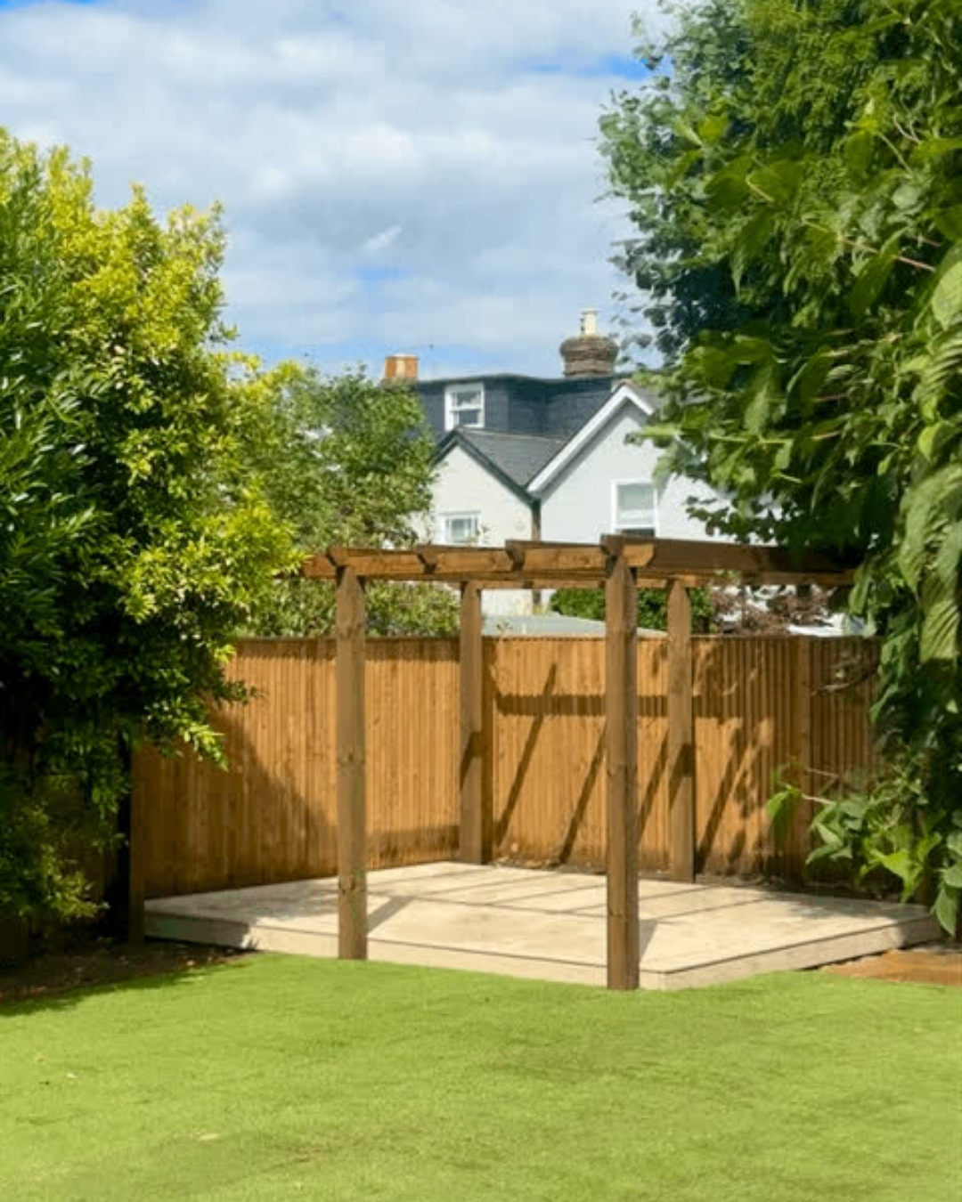 This pergola and garden makeover in Reigate is a perfect balance of structure and softness. With clean lines, fresh turf, and timber features, the space now offers a relaxing environment for everyday use from quiet mornings to hosting friends and family.