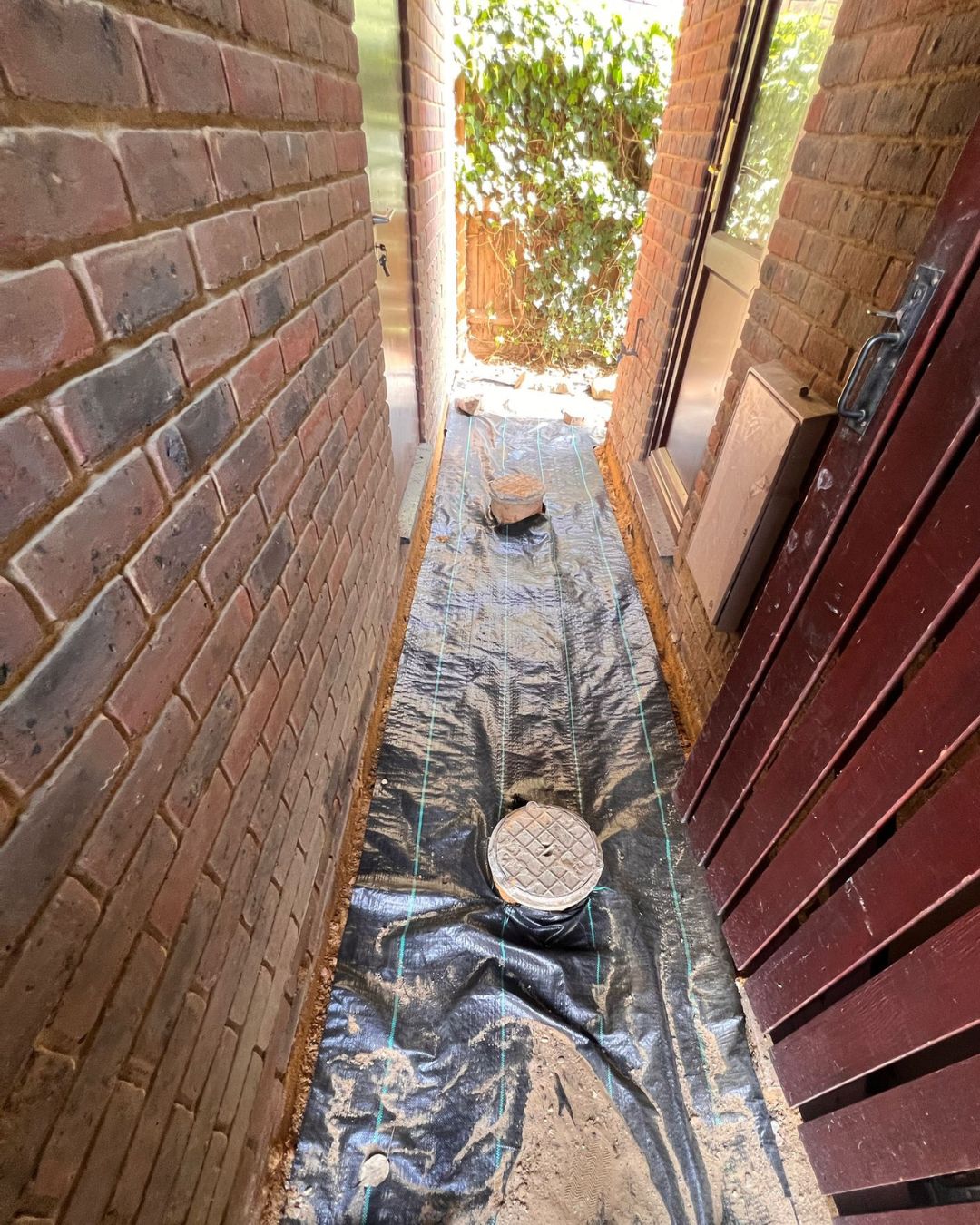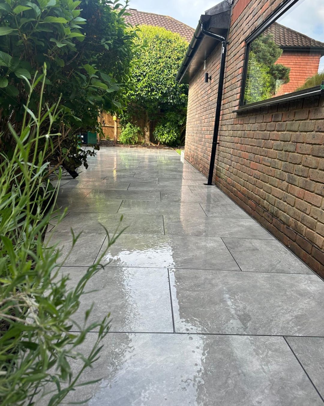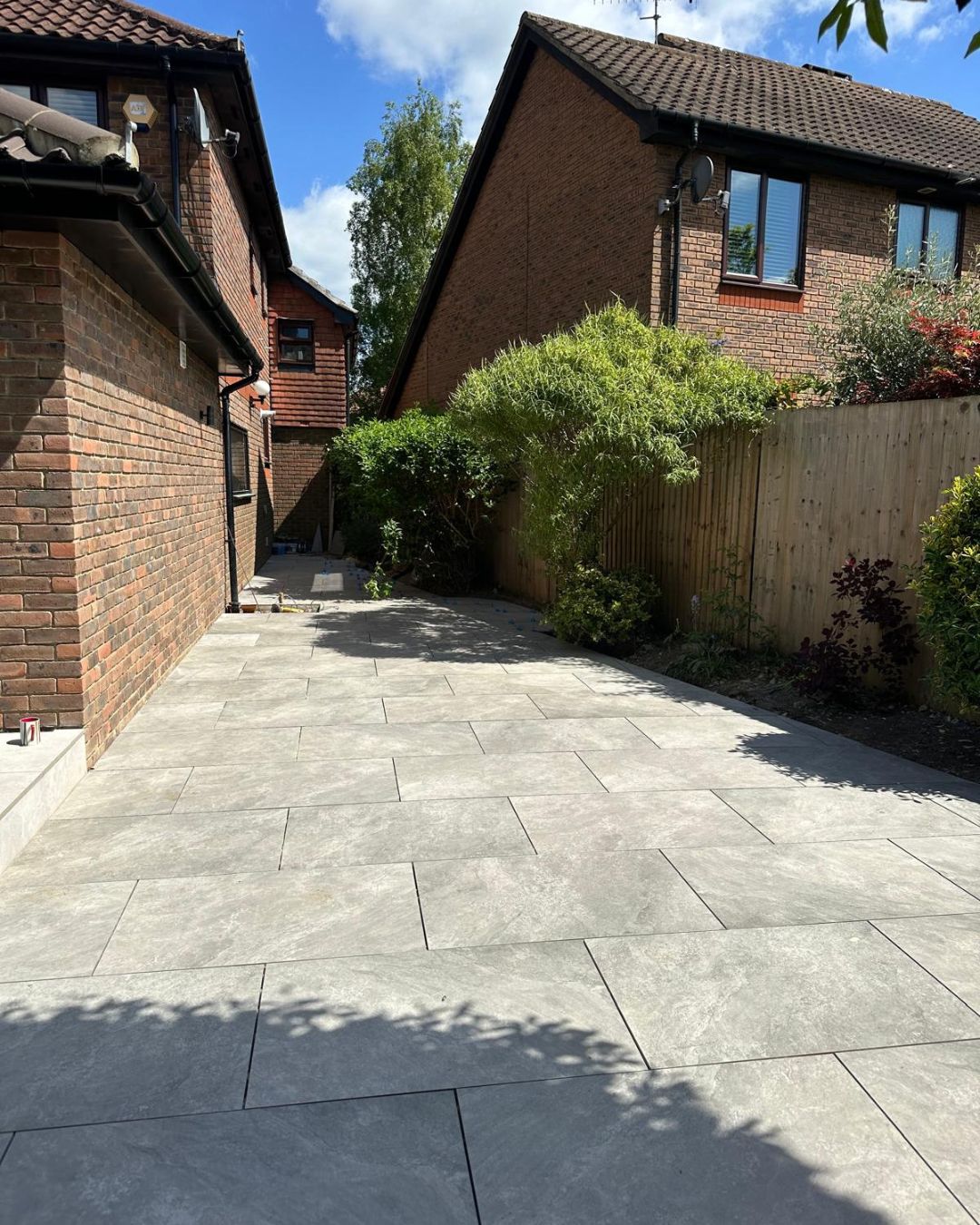 This project in Cobham involved the complete transformation of a long side access and rear patio area. Our goal was to create a seamless, modern finish using high-quality porcelain paving, while ensuring a solid subbase and proper drainage throughout.