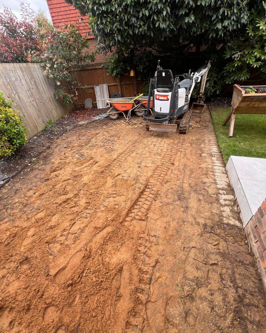 We began by excavating the full working area and preparing a firm foundation. A Geo membrane was laid to prevent the subbase from mixing with the existing soil. We then supplied and compacted 150mm of type 1 crushed concrete using a Wacker plate, ensuring a stable base ready for paving.