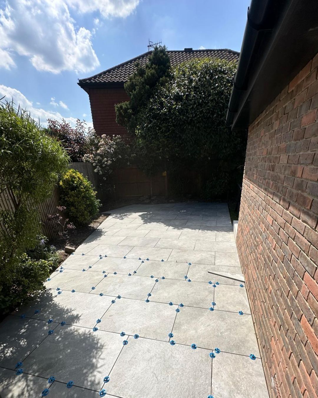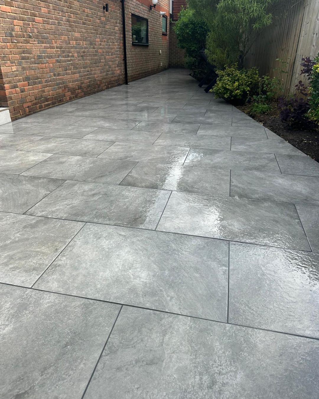 We installed approximately 45 sqm of light grey porcelain paving to create a clean, contemporary finish. Each tile was laid on a full wet mortar bed with a slurry primer applied to the underside of every slab to maximise adhesion and longevity.
